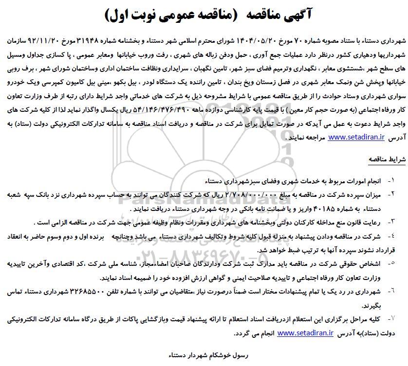 شهرداری دستناء باستناد مصوبه شماره 70 مورخ 1404.05.20 شورای محترم اسلامی شهر دستناء و بخشنامه شماره 31948 مورخ 92.11.20 سازمان شهرداری ها و دهیاری کشور در نظر دارد عملیات جمع آوری ، حمل و دفن زباله های شهری، رفت و روب خیابانها و معابر عمومی ، پاکسازی جداول و مسیل های سطح شهر ، شستشوی معابر ، نگهداری و ترمیم فضای سبز شهر، تامین نگهبان، سرایداری و نظافت ساختمان اداری و ساختمان شورای شهر ، برف روبی خیابان ها و پخش شن و نمک معابر شهری در فصل زمستان و یخ بندان ، تامین راننده یک دستگاه لودر، بیل بکهو، مینی بیل کامیون کمپرسی و یک خودرو سواری شهرداری و ستاد حوادث را از طریق مناقصه عمومی با شرایط مشروحه ذیل به شرکت های خدماتی واجد شرایط دارای رتبه از طرف وزارت تعاون کار و رفاه اجتماعی (به صورت حجم کار معین) با قیمت پایه کارشناسی دوازده ماهه 54.146.476.490 ریال یکسال واگذار نماید . لذا از کلیه شرکت های واجد شرایط دعوت به عمل می آید که در صورت تمایل برای شرکت در مناقصه و دریافت اسناد مناقصه به سامانه تدارکات الکترونیکی دولت (ستاد) به مراجعه نمایند .