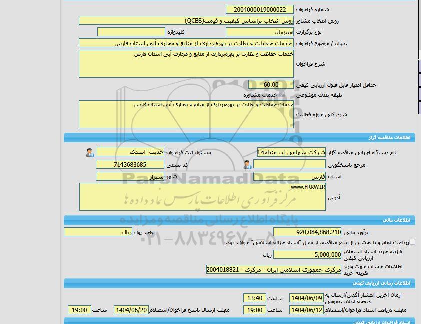 مناقصه خرید خدمات مشاوره خدمات حفاظت و نظارت بر بهره برداری از منابع و مجاری آبی استان فارس از کلیه افراد متخصص و شرکتها واجد شرایط دعوت به عمل میآید در مناقصه با کد خبرگزاری پارس نماد: 9482616 شرکت نمایند.