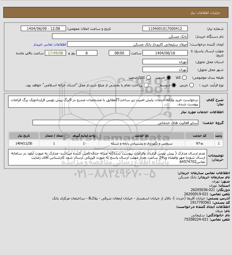 شرح کلی نیاز: درخواست خرید وارائه خدمات پایش امنیت زیر ساختITمطابق با مشخصات مندرج در 9برگ پیش نویس قراردادویک برگ الزامات پیوست شده.