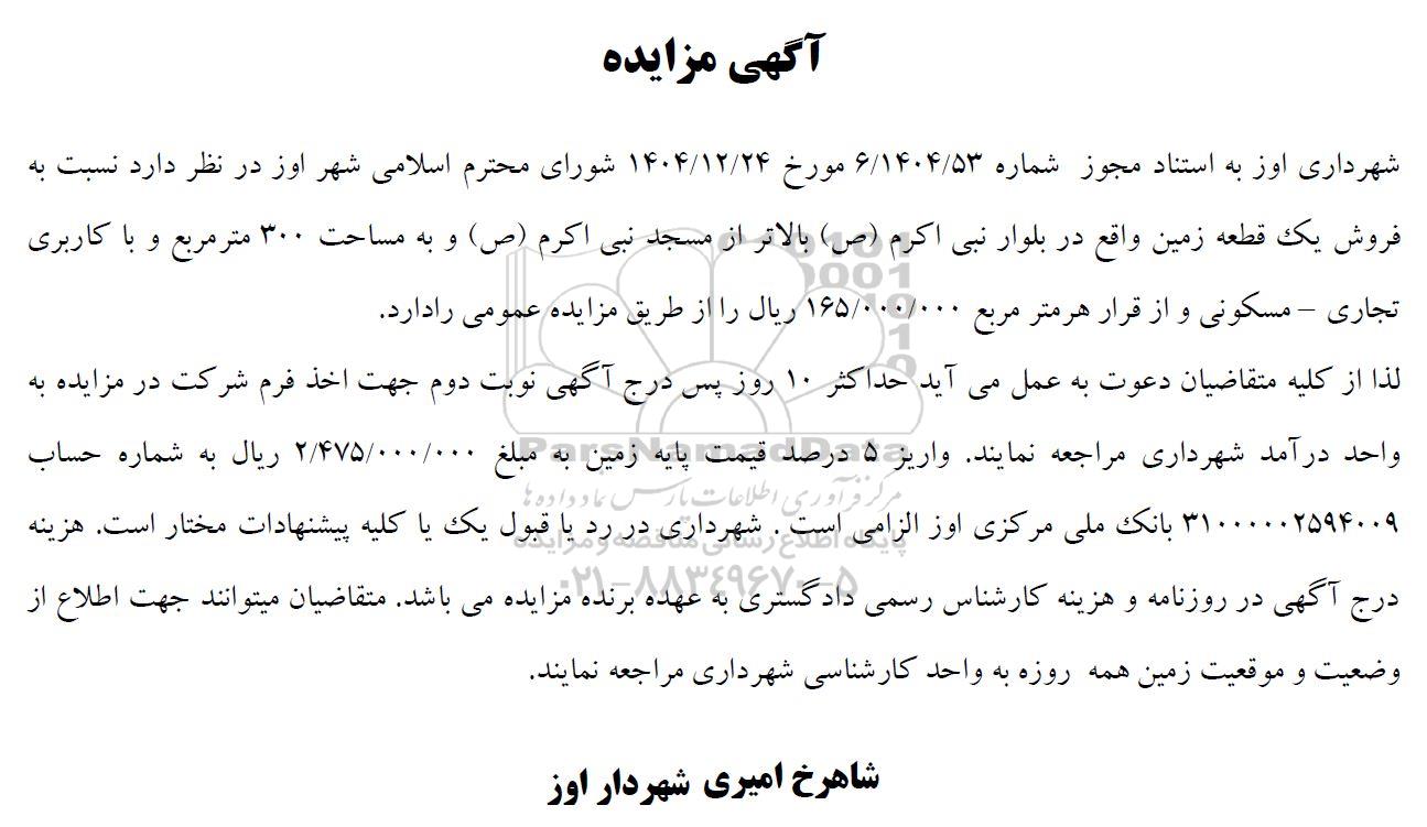 شهرداری اوز به استناد مجوز شماره 6/1404/53 مورخ 1404.12.24 شورای محترم اسلامی شهر اوز در نظر دارد نسبت به فروش یک قطعه زمین واقع در بلوار نبی اکرم (ص) بالاتر از مسجد نبی اکرم (ص) و به مساحت 300 متر مربع و با کاربری تجاری - مسکونی و از قرار هر متر مربع 165.000.000 ریال را از طریق مزایده عمومی را دارد.