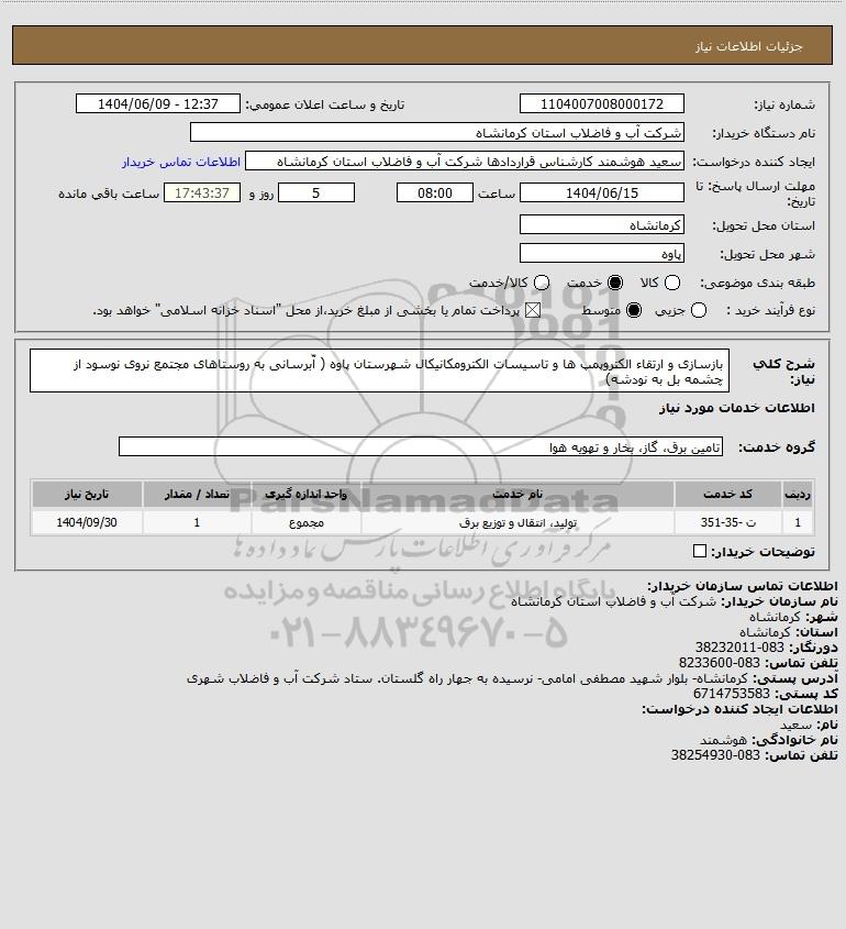شرح کلی نیاز: بازسازی و ارتقاء الکتروپمپ ها و تاسیسات الکترومکانیکال شهرستان پاوه ( آّبرسانی به روستاهای مجتمع نروی نوسود از چشمه بل به نودشه)