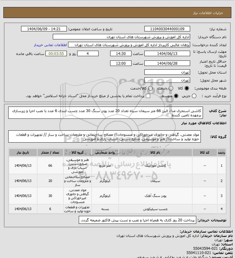 شرح کلی نیاز: کاشی استخری مدل البرز 66 متر سیمان سیاه تعداد 20 عدد پودر سنگ 30 عدد چسب ابندی 6 عدد با نصب اجرا و زیرسازی برعهده تامین کننده