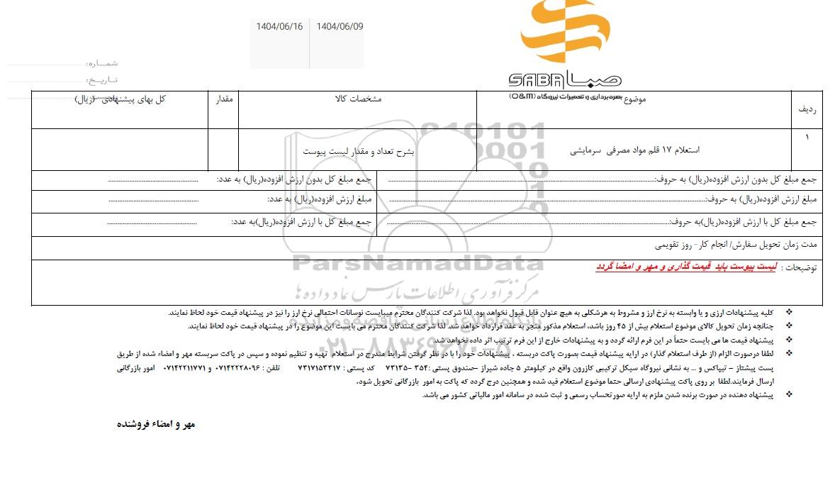 | 1 | استعلام 17 قلم مواد مصرفی سرمایشی | به شرح تعداد و مقدار لیست پیوست | |