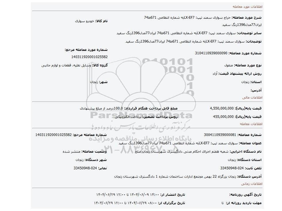 | قیمت پایه(ریال): 455,000,000 | روش پرداخت تضمین: پرداخت الکترونیکی |