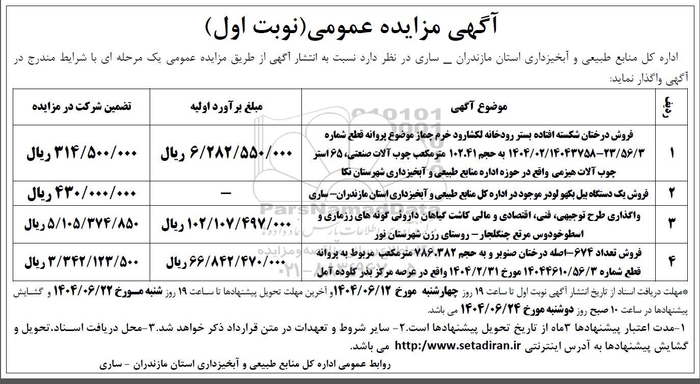 اداره کل منابع طبیعی و آبخیزداری استان مازندران - ساری در نظر دارد نسبت به انتشار آگهی از طریق مزایده عمومی یک مرحله ای با شرایط مندرج در آگهی واگذار نماید: