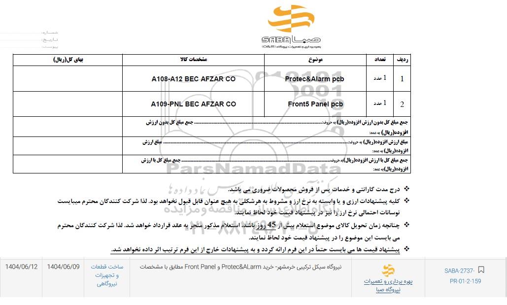 استعلام بها و موضوع استعلام استعلام خرید Protec&ALarm و Front Panel به اطلاع کلیه شرکتها و افراد متخصص واجد شرایط میرساند، آگهی گذار در نظر دارد از طریق استعلام بها، نسبت به انتخاب و دریافت پیشنهادات اقدام نماید. این استعلام با کد آگهی ثبت شده در سامانه خبرگزاری پارس نماد : 9483477 منتشر شده است. مشخصات استعلام : تاریخ شروع استعلام: 1404/06/09 آخرین مهلت ارسال پیشنهاد قیمت : 1404/06/12 و محل اجرای پروژه : استان خوزستان میباشد. استعلام قیمت مورد درخواست : استعلام خرید Protec&ALarm و Front Panel با دستهبندیهای تخصصی و گروه های مرتبط : انواع تابلو و راکهای مخابراتی و برقی, سیستم های حفاظتی-دوربین مدار بسته،دزدگیر،آیفون تصویری و آنتن مرکزی, اتوماسیون ، مراکز کنترل صنعتی, نیروگاه, تجهیزات برق و الکترونیک, استعلام اطلاع رسانی میگردد. شرایط شرکت در استعلام آنلاین : ابتدا ثبت نام در سامانه استعلام پارس نماد و تکمیل مدارک موردنیاز و بارگذاری در سامانه رعایت تمامی ضوابط و الزامات مندرج در اسناد استعلام است.