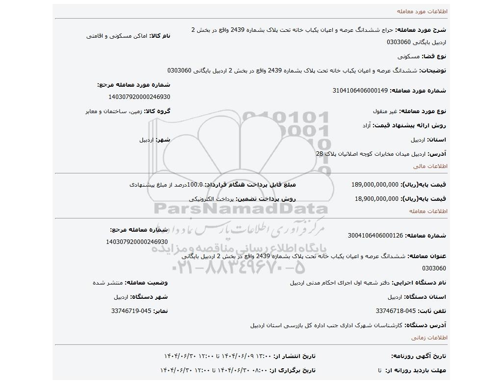 مزایده عمومی مزایده ششدانگ عرصه و اعیان یکباب خانه تحت پلاک بشماره 2439 واقع در بخش 2 اردبیل بایگانی 0303060 برگزار میگردد. از کلیه افراد متخصص و شرکتهای واجد شرایط دعوت به عمل میآید تا در این مزایده با کد خبرگزاری پارس نماد : 9483498 شرکت نمایند تاریخ شروع مزایده : 1404/06/09 مهلت شرکت در مزایده: تا پایان روز 1404/06/30