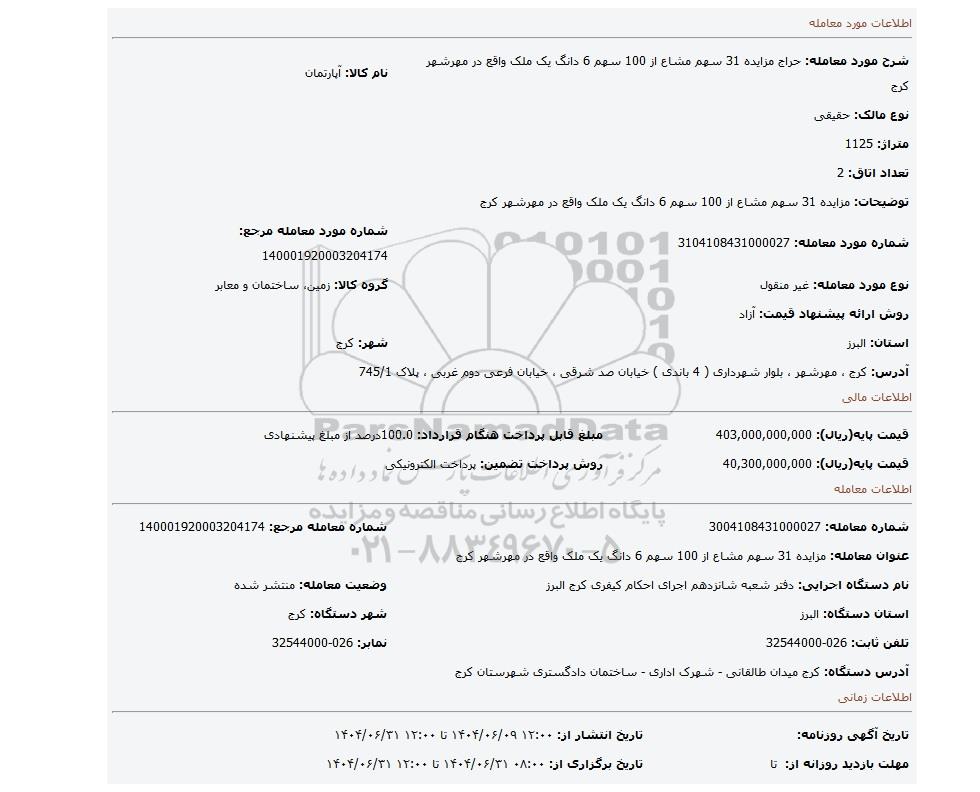 شرح مورد معامله: حراج مزایده 31 سهم مشاع از 100 سهم 6 دانگ یک ملک واقع در مهرشهر کرجنام کالا: آپارتمان