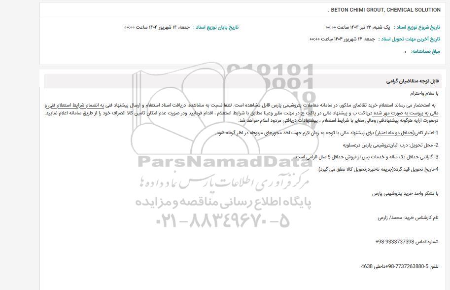 به استحضار می رساند استعلام خرید تقاضای مذکور در سامانه معاملات پتروشیمی پارس قابل مشاهده است. لطفا نسبت به مشاهده دریافت استاد استعلام و ارسال پیشنهاد فنی به انضمام شرایط استعلام فنی و مالی به پیوست به صورت مهر شده در پاکت ب و پیشنهاد مالی در پاکت ج در مهلت مقرر و عينا مطابق با شرایط استعلام ، اقدام فرمایید و در صورت عدم امکان تامین کالا انصراف خود را از طریق سامانه اعلام نمایید. در صورت ارایه هرگونه پیشنهاد فتی و مالی مغایر با شرایط استعلام ، پیشنهادات دریافتی مردود اعلام خواهد شد.