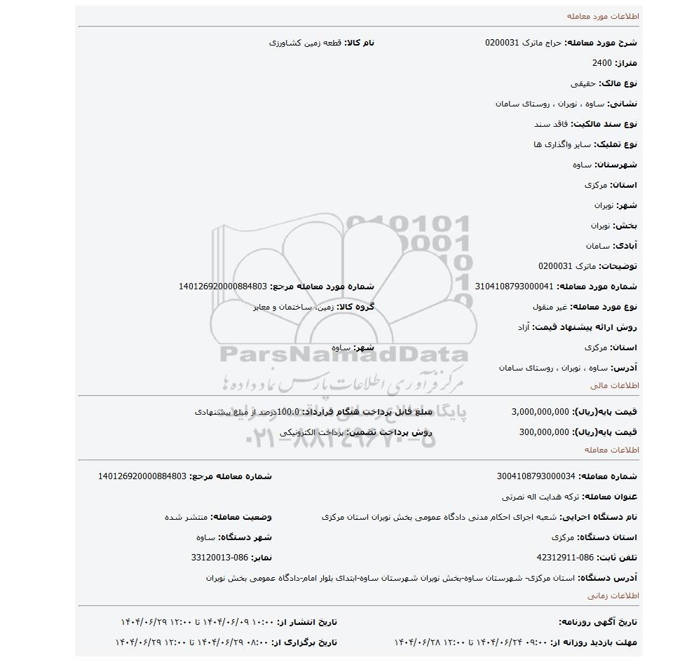 شرح مورد معامله: حراج ماترک 0200031نام کالا: قطعه زمین کشاورزی