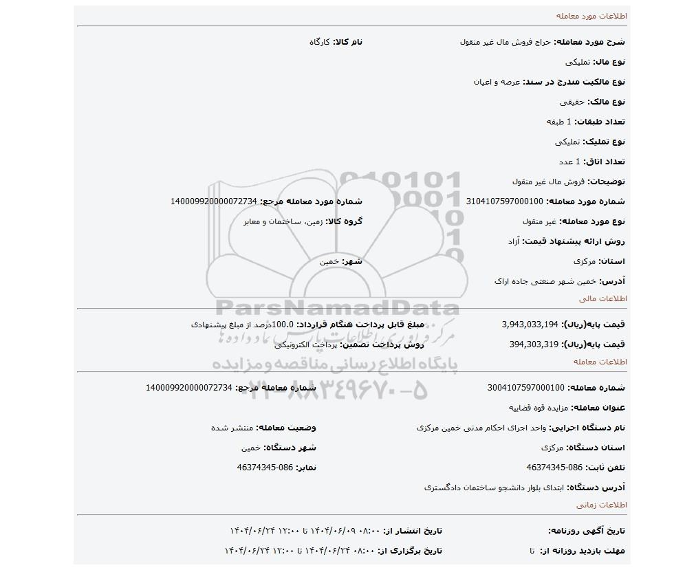 شرح مورد معامله: حراج فروش مال غیر منقول | نام کالا: کارگاه | |