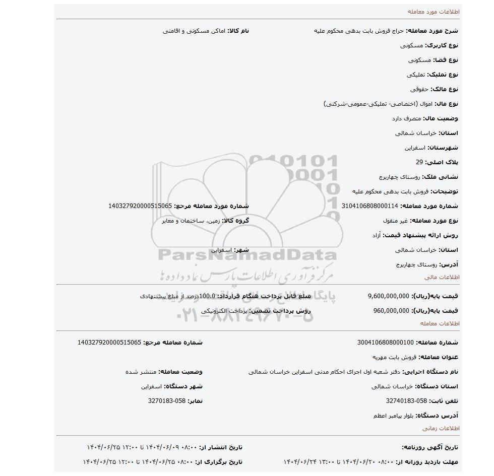 مزایده عمومی مزایده فروش بابت بدهی محکوم علیه برگزار میگردد. از کلیه افراد متخصص و شرکت‌های واجد شرایط دعوت به عمل می‌آید تا در این مزایده با کد خبرگزاری پارس نماد : 9483635 شرکت نمایند تاریخ شروع مزایده : 1404/06/09 مهلت شرکت در مزایده: تا پایان روز 1404/06/25 مکان برگزاری اموال واگذاری استان‌های خراسان شمالی و دسته‌بندی‌های مربوط به این حراجی املاک و زمین میباشد. اطلاعات دقیق‌تر درباره شرایط شرکت در مزایده آنلاین و نحوه ارسال مدارک، الزامات پروژه و دریافت اسناد مزایده و تاریخ بازگشایی پاکت‌ها، در بخش اطلاعات تکمیلی این آگهی درج شده است.