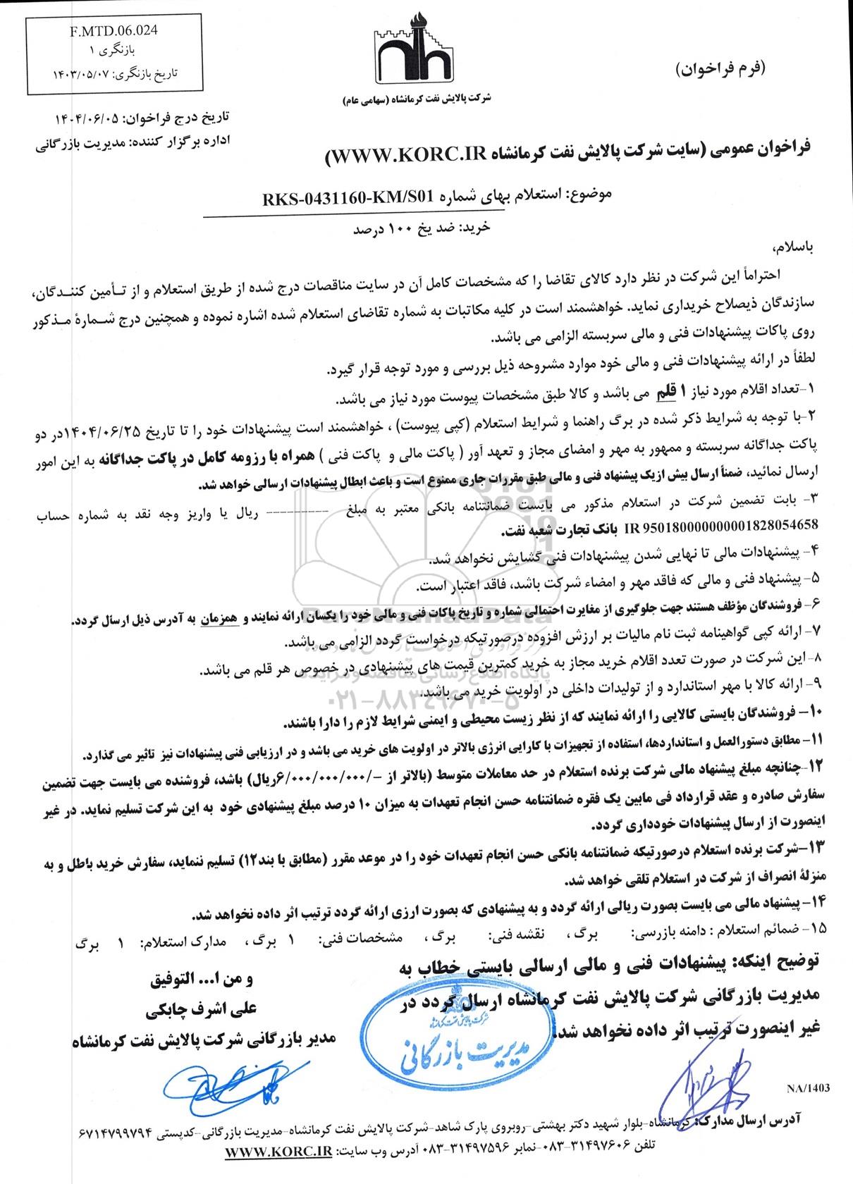 موضوع: استعلام بهای شماره RKS-0431160-KM/S01