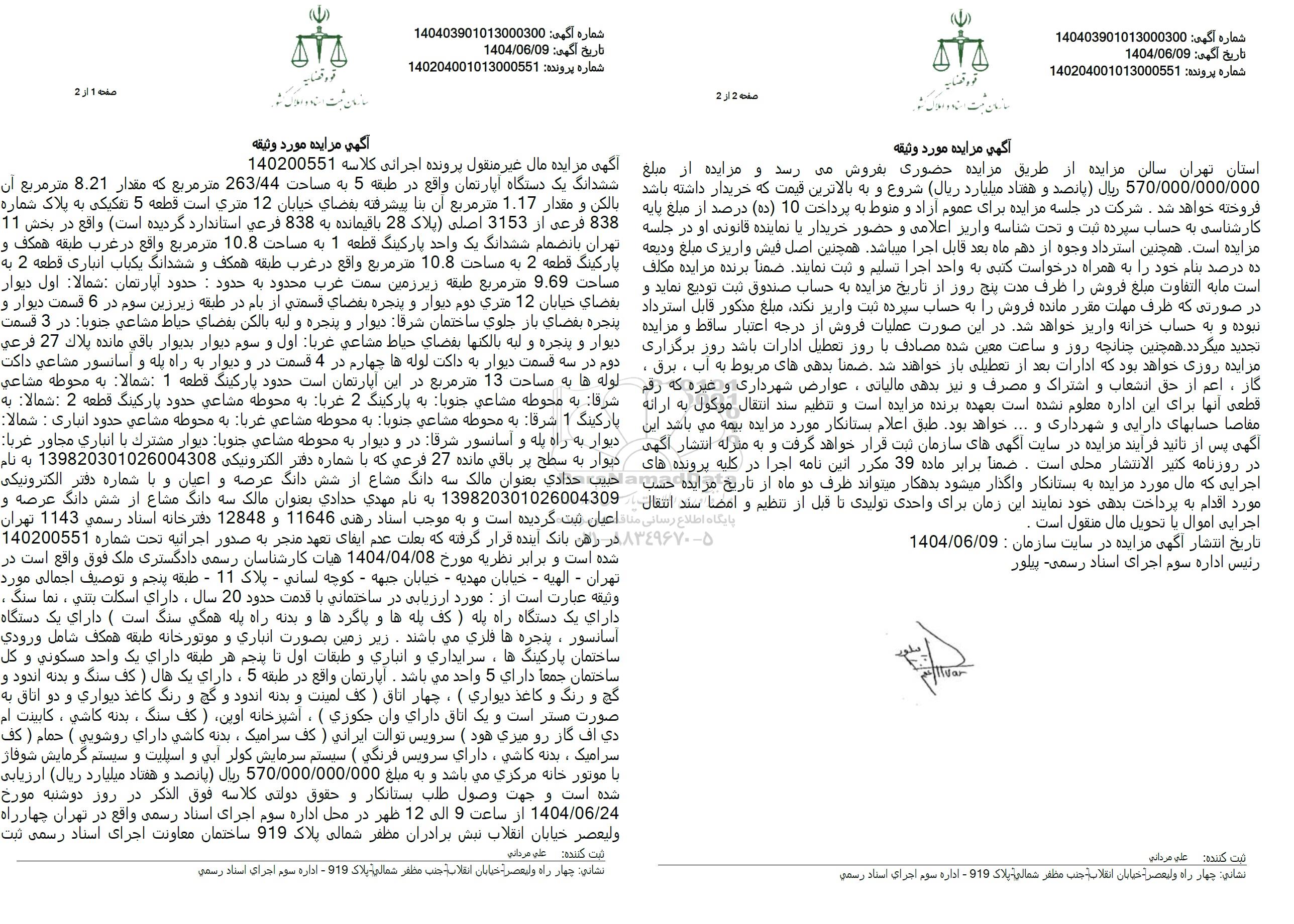 مزایده ششدانگ یک دستگاه آپارتمان مساحت 263.44 مترمربع