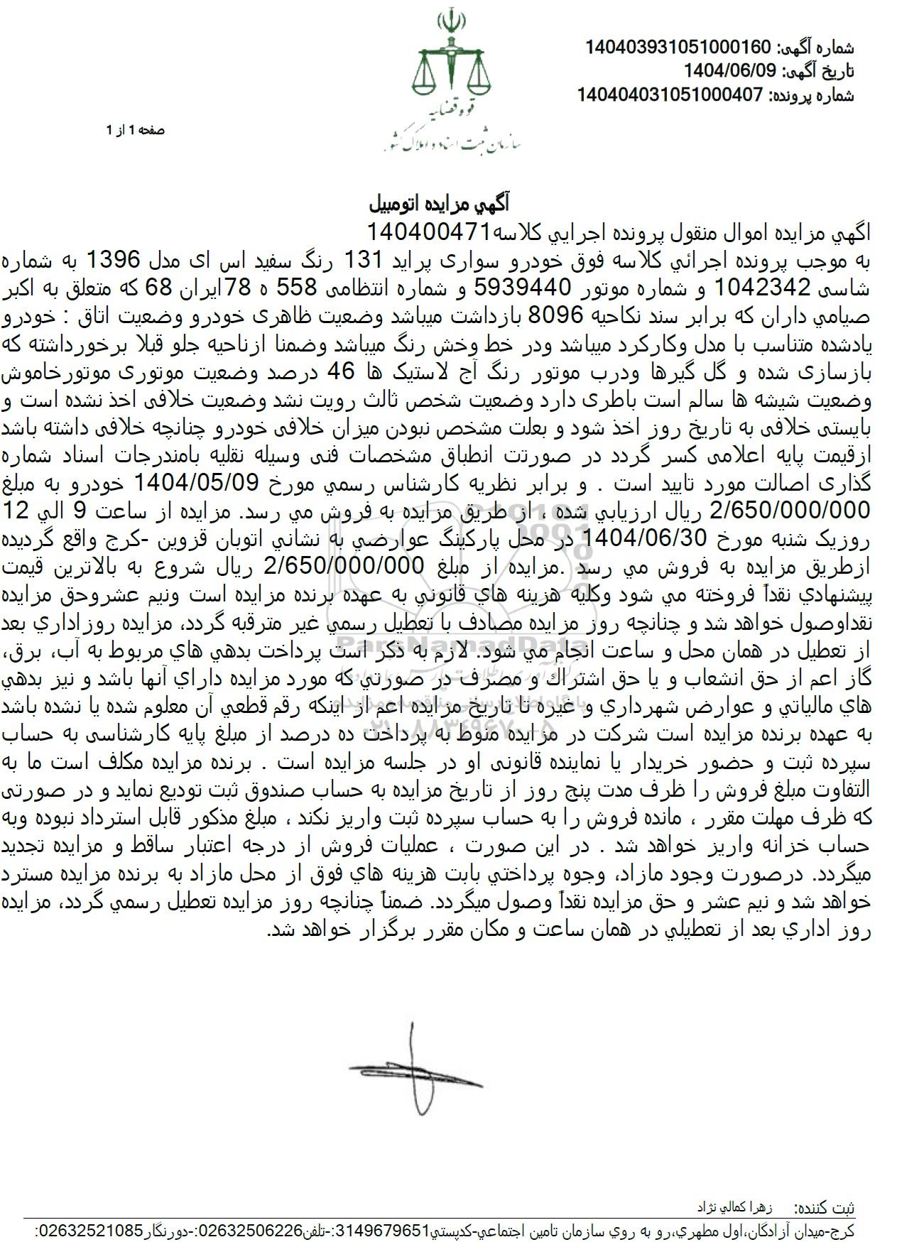 مزایده خودرو سواری پراید 131 رنگ سفید, مزایده خودرو سواری پراید 131 رنگ سفید