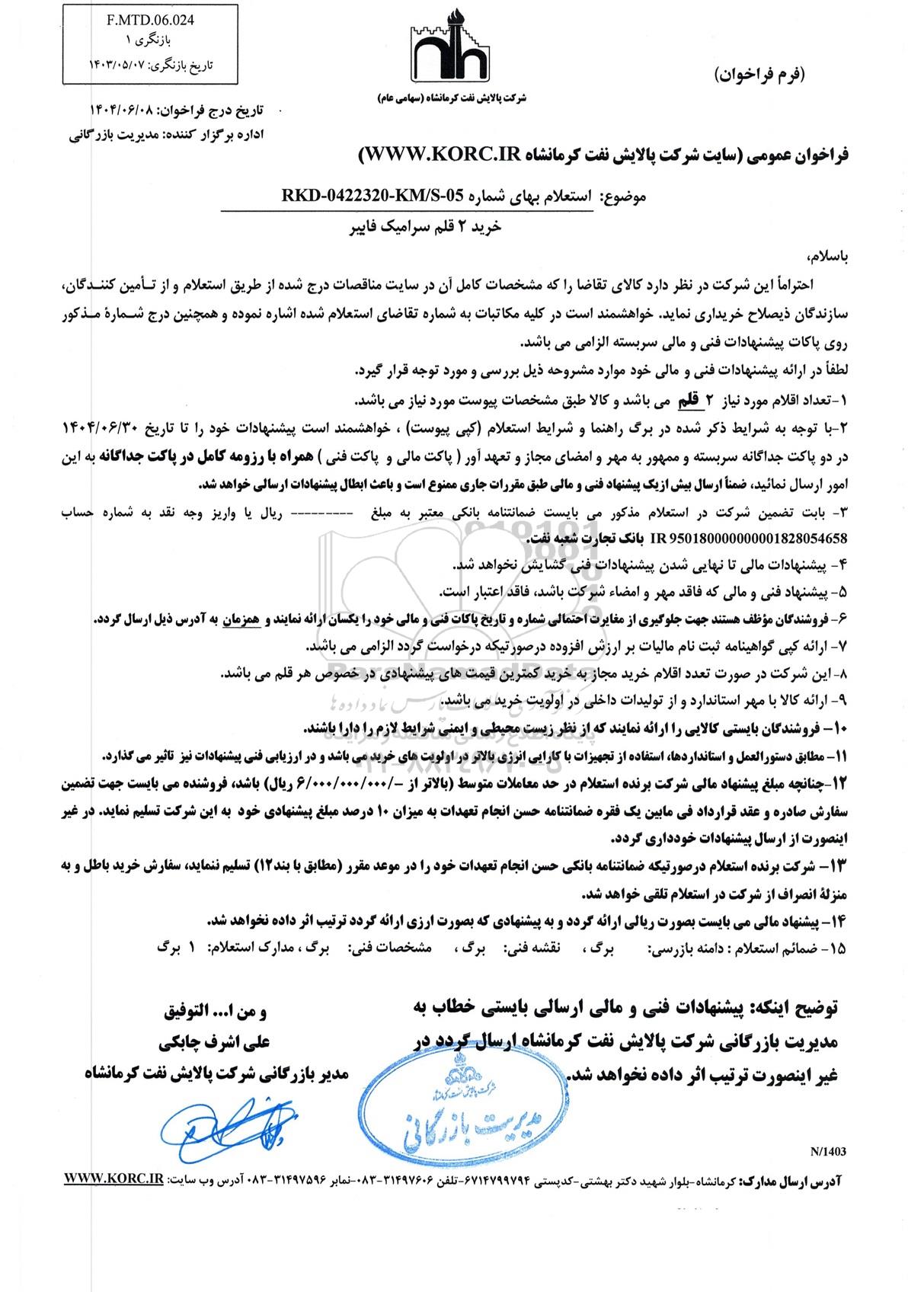 موضوع: استعلام بهای شماره RKD-0422320-KM/S-05