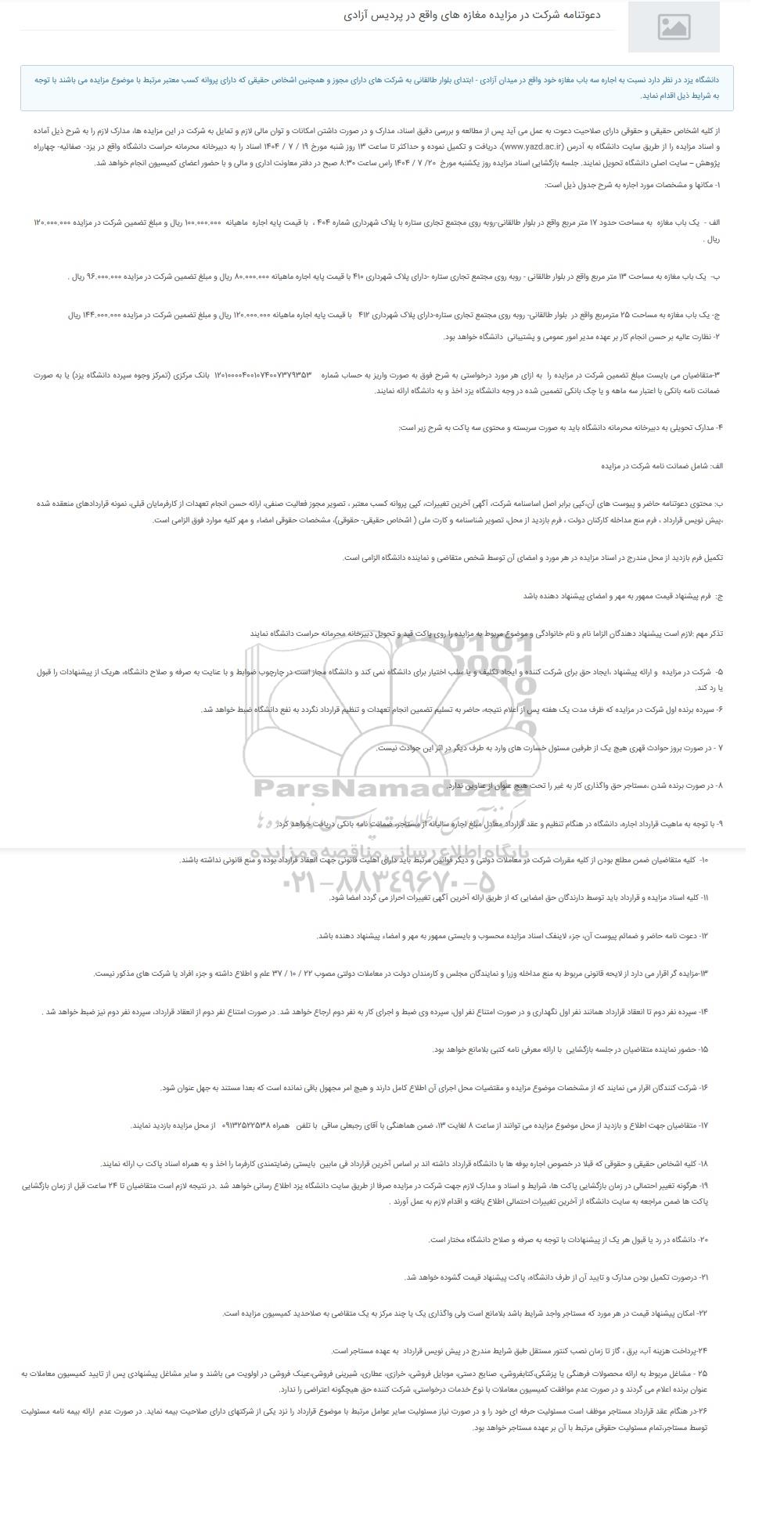 دعوتنامه شرکت در مزایده مغازه های واقع در پردیس آزادی