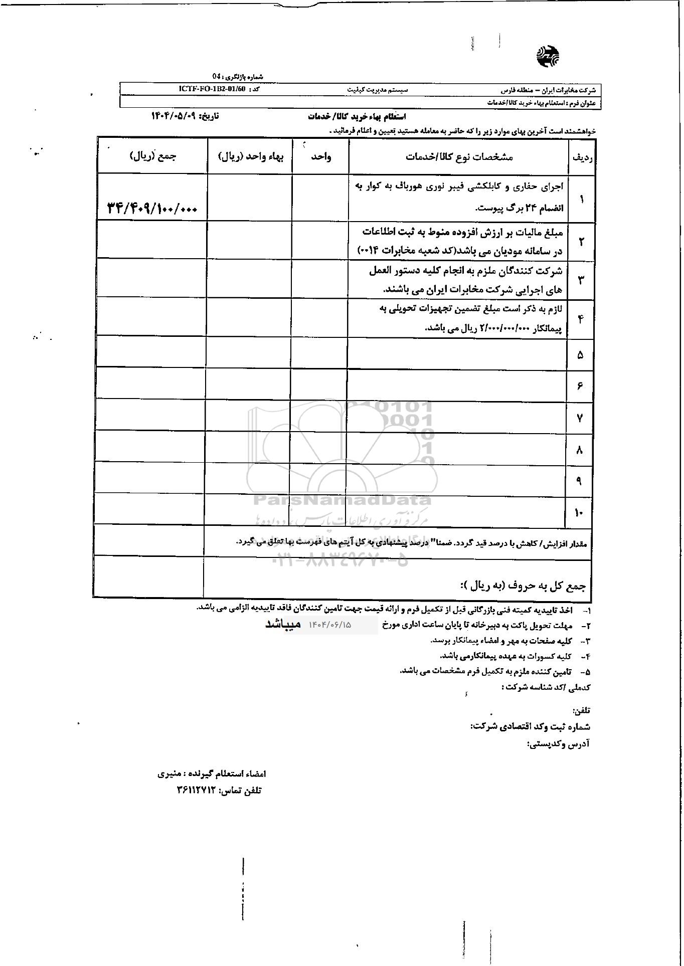 خواهشمند است آخرین بهای موارد زیر را که حاضر به معامله هستید تعیین و اعلام فرمائید.