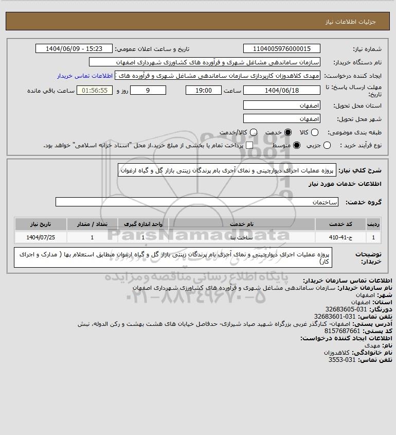 شرح کلی نیاز: پروژه عملیات اجرای دیوارچینی و نمای آجری بام پرندگان زینتی بازار گل و گیاه ارغوان
