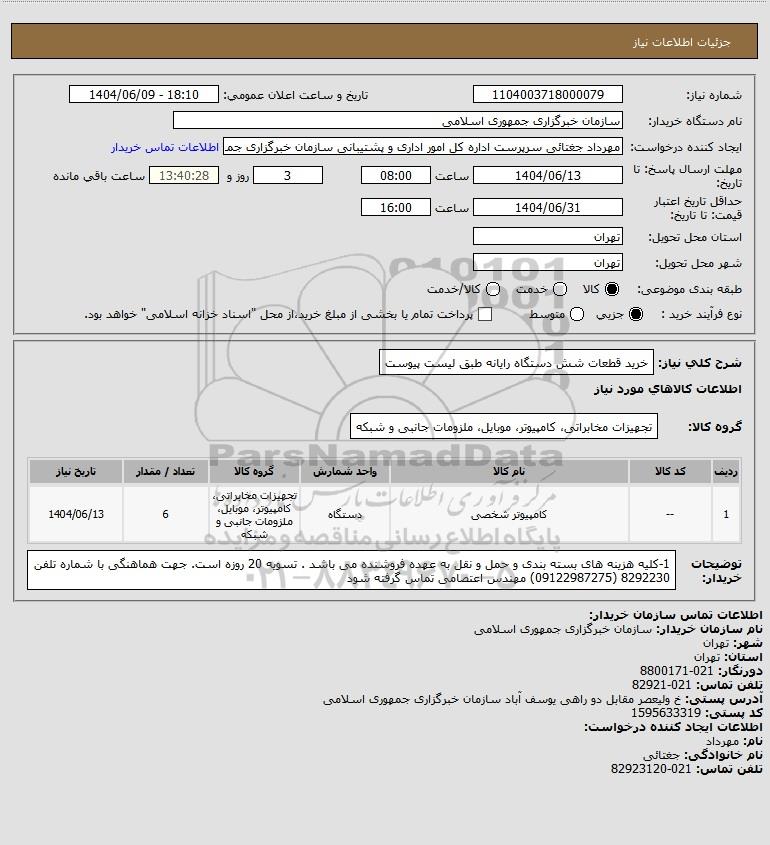 | 1 | -- | کامپیوتر شخصی | دستگاه | تجهیزات مخابراتی، کامپیوتر، موبایل، ملزومات جانبی و شبکه | 6 | 1404/06/13 |
