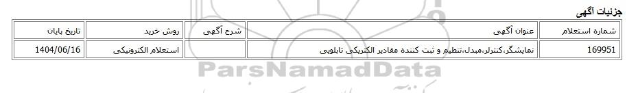 | 169951 | نمایشگر،کنترلر،مبدل،تنطیم و ثبت کننده مقادیر الکتریکی تابلویی | استعلام الکترونیکی | 1404/06/16 |