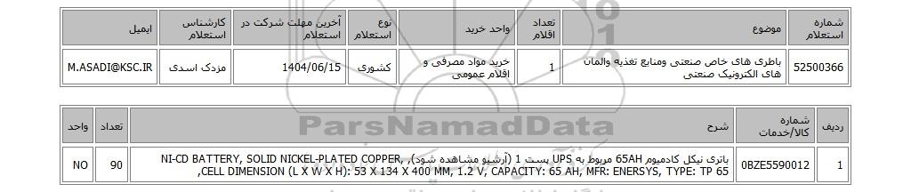 | 52500366 | باطری های خاص صنعتی ومنابع تغذیه والمان های الکترونیک صنعتی | 1 | خرید مواد مصرفی و اقلام عمومی | کشوری | 1404/06/15 | مزدک اسدی | M.ASADI@KSC.IR |