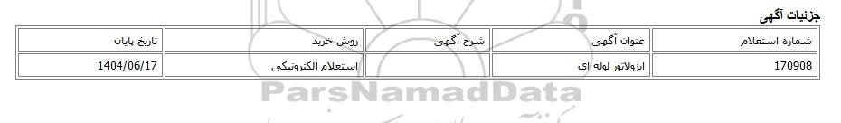 | 170908 | ایزولاتور لوله ای | استعلام الکترونیکی | 1404/06/17 |