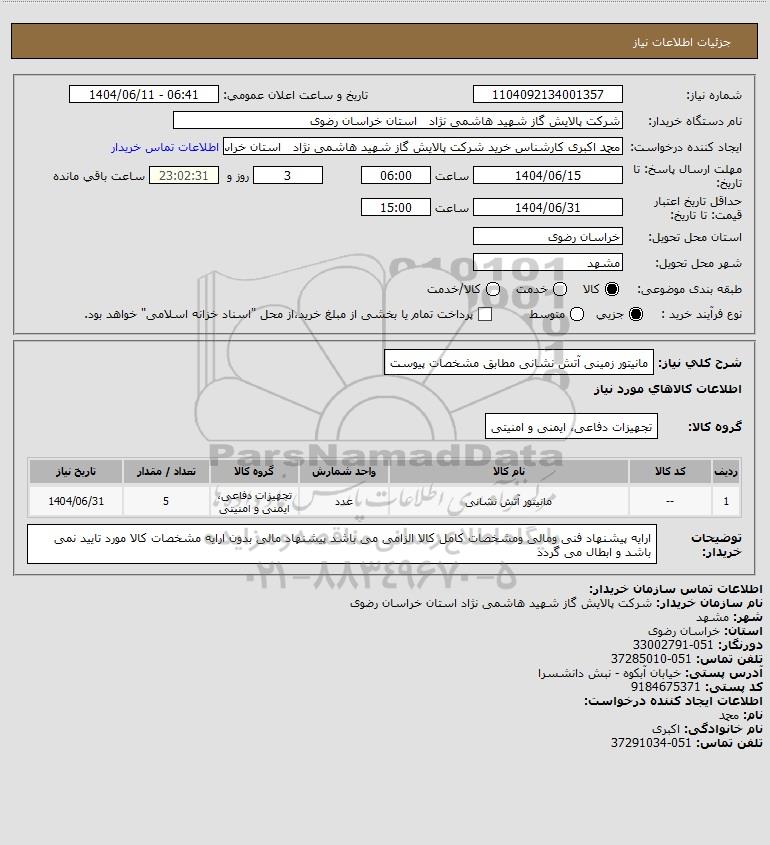 شرح کلی نیاز: مانیتور زمینی آتش نشانی مطابق مشخصات پیوست