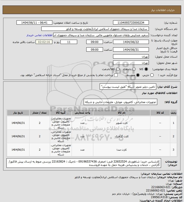 3 -- کارت صدا عدد تجهیزات مخابراتی، کامپیوتر، موبایل، ملزومات جانبی و شبکه 2 1404/06/31