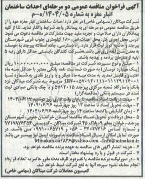 شرکت میناکان (سهامی خاص) در نظر دارد احداث ساختمان انبار مغزه حود را از طریق مناقصه عمومی دو مرحله ای به پیمانکار واجد شرایط واگذار نماید. لذا از کلیه پیمانکاران دارای صلاحیت و تجربه مفید جهت مشارکت در مناقصه دعوت می شود.