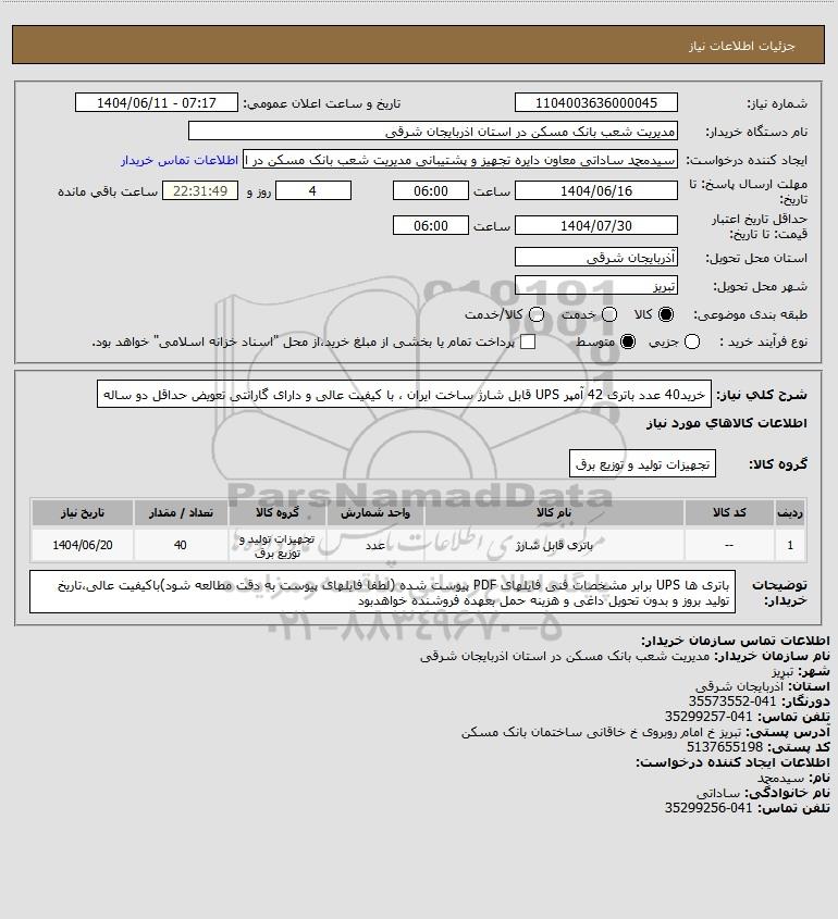 شرح کلی نیاز: خرید40 عدد باتری 42 آمپر UPS قابل شارژ ساخت ایران ، با کیفیت عالی و دارای گارانتی تعویض حداقل دو ساله