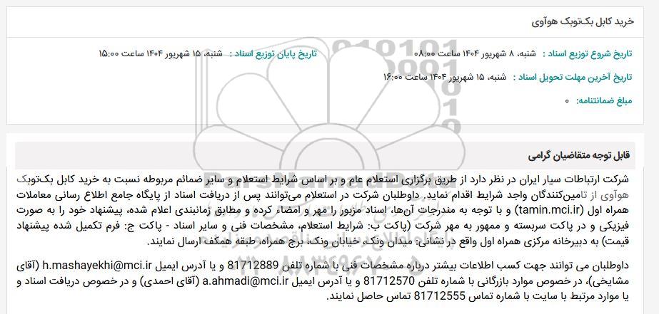 شرکت ارتباطات سیار ایران در نظر دارد از طریق برگزاری استعلام عام و بر اساس شرایط استعلام و سایر ضمائم مربوطه نسبت به خرید کابل بکتوبک هوآوی از تامینکنندگان واجد شرایط اقدام نماید. داوطلبان شرکت در استعلام میتوانند پس از دریافت اسناد از پایگاه جامع اطلاع رسانی معاملات همراه اول (tamin.mci.ir) و با توجه به مندرجات آنها، اسناد مزبور را مهر و امضاء کرده و مطابق زمانبندی اعلام شده، پیشنهاد خود را به صورت فیزیکی و در پاکت سربسته و ممهور به مهر شرکت (پاکت ب: شرایط استعلام، مشخصات فنی و سایر اسناد - پاکت ج: فرم تکمیل شده پیشنهاد قیمت) به دبیرخانه مرکزی همراه اول واقع در نشانی: میدان ونک، خیابان ونک، برج همراه، طبقه همکف ارسال نمایند.