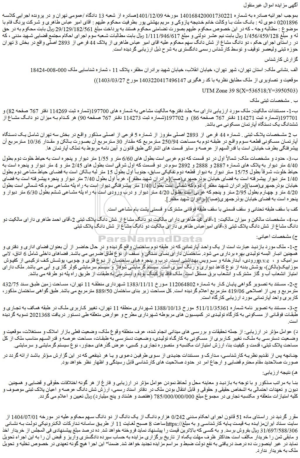 بموجب اجرائیه صادره به شماره 140168420001730221 مورخه 1401/12/09صادره از شعبه 13 دادگاه /عمومی تهران و در پرونده اجرایی کلاسه 0201896 دعوی له : بانک ملت با وکالت خانم خدیجه پازوکی و مریم بهشتی پور بطرفیت محکوم علیهم : اقای امیر عباس طاهری و شرکت پرنگ فام با موضوع : مطالبه وجه - که در این خصوص محکوم علیهم بصورت تضامنی محکوم هستند به پرداخت مبلغ 29/129/182/561 ریال بابت محکوم به در حق له و مبلغ 1/456/459/128 ریال بابت نیم عشر دولتی و مبلغ 1/111/946/617 ریال بابت مطالبات شعبه سوم اجرای احکام مجتمع قضایی شهید مدنی ، که در راستای اجرای حکم ، دو دانگ مشاع از شش دانگ سهم محکوم علیه اقای امیر عباس طاهری از پلاک 44 فرعی از 2893 اصلی واقع در بخش 3 تهران حوزه ثبتی ولیعصر توقیف و توسط کارشناس رسمی دادگستری به شرح ذیل ارزیابی گردیده است.