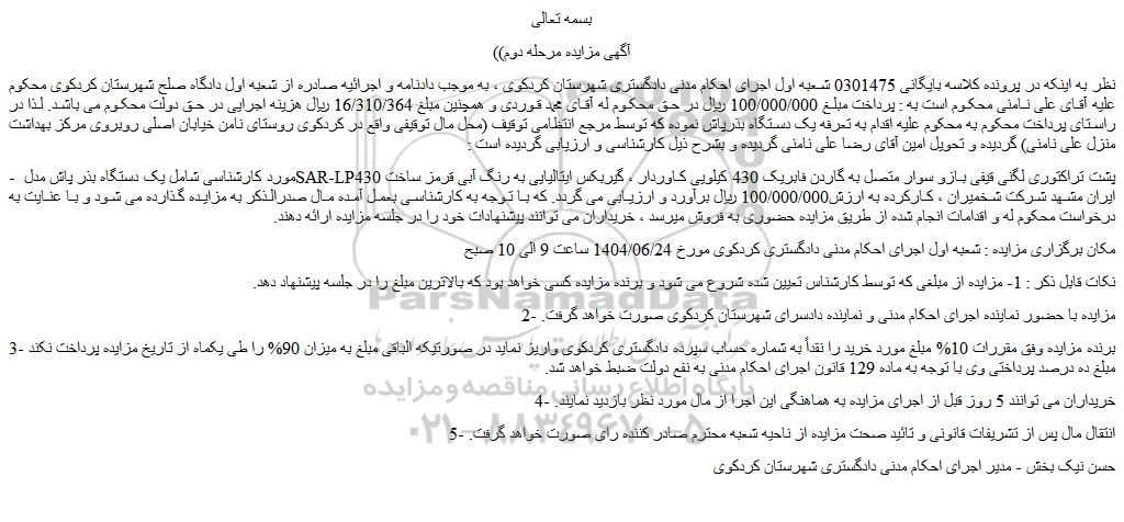 نظر به اینکه در پرونده کلاسه بایگانی 0301475 شعبه اول اجرای احکام مدنی دادگستری شهرستان کردکوی ، به موجب دادنامه و اجرائیه صادره از شعبه اول دادگاه صلح شهرستان کردکوی محکوم علیه آقای علی نامنی محکوم است به : پرداخت مبلغ 100/000/000 ریال در حق محکوم له آقای محمد قوردی و همچنین مبلغ 16/310/364 ریال هزینه اجرایی در حق دولت محکوم می باشد. لذا در راستای پرداخت محکوم به محکوم علیه اقدام به تعرفه یک دستگاه بذرپاش نموده که توسط مرجع انتظامی توقیف (محل مال توقیفی واقع در کردکوی روستای نامن خیابان اصلی روبروی مرکز بهداشت منزل علی نامنی) گردیده و تحویل امین آقای رضا علی نامنی گردیده و بشرح ذیل کارشناسی و ارزیابی گردیده است :