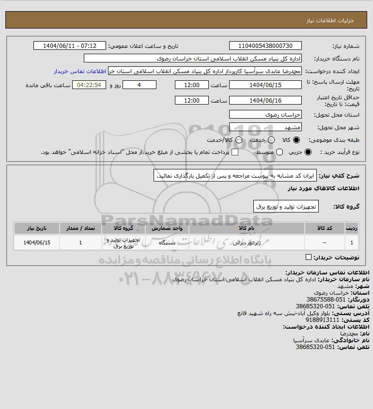 نام دستگاه خریدار:اداره کل بنیاد مسکن انقلاب اسلامی استان خراسان رضوی