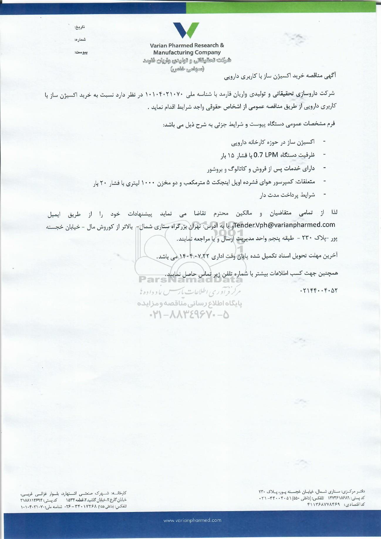 شرکت داروسازی تحقیقاتی و تولیدی واریان فارمد با شناسه ملی 10104021070 در نظر دارد نسبت به خرید اکسیژن ساز با کاربری دارویی از طریق مناقصه عمومی از اشخاص حقوقی واجد شرایط اقدام نماید .