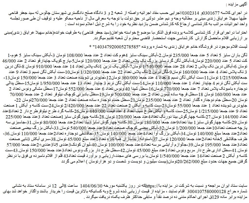 در اجرای کلاسه 0301677و 0302314/اجرایی حسب مفاد اجرائیه واصله از شعبه 2 و 3 دادگاه صلح دادگستری شهرستان چالوس له سید جعفر فتاحی علیها سهیلا غرایاق زندی مبنی بر مطالبه وجه و نیم عشر دولتی در حق دولت با توجه به معرفی مال از ناحیه محکو علیه و توقیف آن طی صورتجلسه واحد اجرائیات مراتب به کارشناسی ارجاع که کارشناس ضمن بازدید نظریه خود را به شرح ذیل اعلام نموده است :