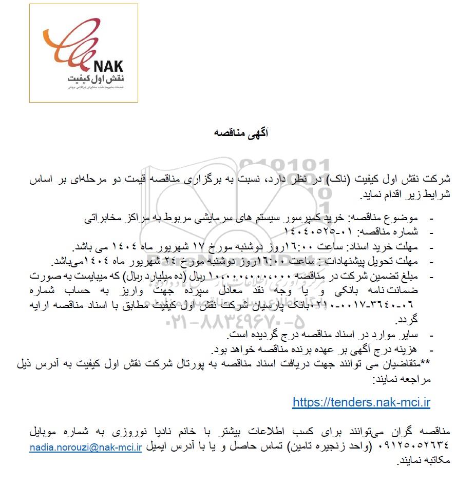 مناقصه گران می توانند برای کسب اطلاعات بیشتر با خانم نادیا نوروزی به شماره موبایل 09125052634 (واحد زنجیره تامین) تماس حاصل و یا با آدرس ایمیل nadia.norouzi@nak-mci.ir مکاتبه نمایند.