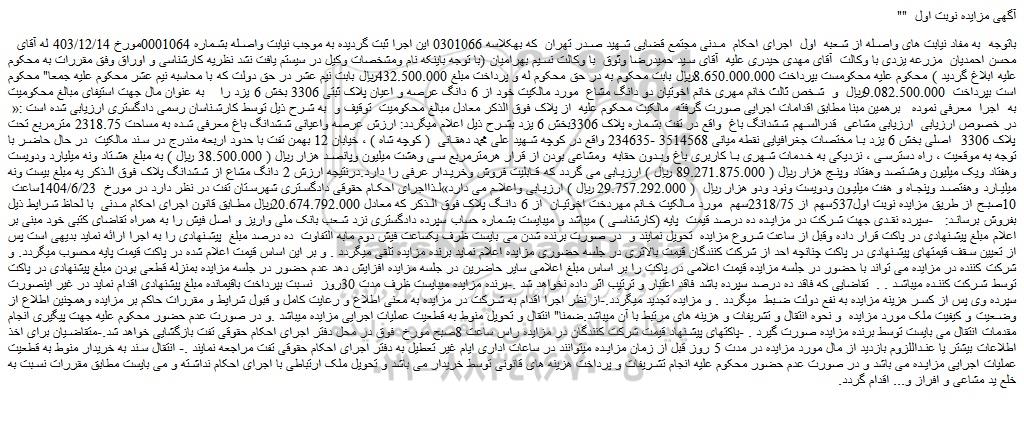 باتوجه به مفاد نیابت های واصله از شعبه اول اجرای احکام مدنی مجتمع قضایی شهید صدر تهران که بهکلاسه 0301066 این اجرا ثبت گردیده به موجب نیابت واصله بشماره 0001064مورخ 403/12/14 له آقای محسن احمدیان مزرعه یزدی با وکالت آقای مهدی حیدری علیه آقای سید حمیدرضا وثوق با وکالت نسیم بهرامیان (با توجه باینکه نام ومشخصات وکیل در سیستم یافت نشد نظریه کارشناسی و اوراق وفق مقررات به محکوم علیه ابلاغ گردید ) محکوم علیه محکومست بپرداخت 8.650.000.000ریال بابت محکوم به در حق محکوم له و پرداخت مبلغ 432.500.000ریال بابت نیم عشر در حق دولت که با محاسبه نیم عشر محکوم علیه جمعا" محکوم است بپرداخت 9.082.500.000ریال و شخص ثالث خانم مهری خانم اخوتیان دو دانگ مشاع مورد مالکیت خود از 6 دانگ عرصه و اعیان پلاک ثبتی 3306 بخش 6 یزد را به عنوان مال جهت استیفای مبالغ محکومیت به اجرا معرفی نموده برهمین مبنا مطابق اقدامات اجرایی صورت گرفته مالکیت محکوم علیه از پلاک فوق الذکر معادل مبالغ محکومیت توقیف و به شرح ذیل توسط کارشناسان رسمی دادگستری ارزیابی شده است :« در خصوص ارزیابی ارزیابی مشاعی قدرالسهم ششدانگ باغ واقع در تفت بشماره پلاک 3306بخش 6 یزد بشرح ذیل اعلام میگردد: ارزش عرصه واعیانی ششدانگ باغ معرفی شده به مساحت 2318.75 مترمربع تحت پلاک 3306 اصلی بخش 6 یزد با مختصات جغرافیایی نقطه میانی 3514568 -234635 واقع در کوچه شهید علی محمد دهقانی ( کوچه شاه ) ، خیابان 12 بهمن تفت با حدود اربعه مندرج در سند مالکیت در حال حاضر با توجه به موقعیت ، راه دسترسی ، نزدیکی به خدمات شهری با کاربری باغ وبدون حقابه ومشاعی بودن از قرار هرمترمربع سی وهشت میلیون وپانصد هزار ریال ( 38.500.000 ریال ) به مبلغ هشتاد ونه میلیارد ودویست وهفتاد ویک میلیون وهشتصد وهفتاد وپنج هزار ریال ( 89.271.875.000 ریال ) ارزیابی می گردد که قابلیت فروش وخریدار عرفی را دارد.درنتیجه ارزش 2 دانگ مشاع از ششدانگ پلاک فوق الذکر یه مبلغ بیست ونه میلیارد وهفتصد وپنجاه و هفت میلیون ودویست ونود ودو هزار ریال ( 29.757.292.000 ریال ) ارزیابی واعلام می دارد»لذااجرای احکام حقوقی دادگستری شهرستان تفت در نظر دارد در مورخ 1404/6/23ساعت 10صبح از طریق مزایده نوبت اول537سهم از 2318/75سهم مورد مالکیت خانم مهردخت اخوتیان از 6 دانگ پلاک فوق الذکر که معادل 20.674.792.000ریال مطابق قانون اجرای احکام مدنی با لحاظ شرایط ذیل بفروش برساند: -سپرده نقدی جهت شرکت در مزایده ده درصد قیمت پایه (کارشناسی ) میباشد و میبایست بشماره حساب سپرده دادگستری نزد شعب بانک ملی واریز و اصل فیش را به همراه تقاضای کتبی خود مبنی بر اعلام مبلغ پیشنهادی در پاکت قرار داده وقبل از ساعت شروع مزایده تحویل نمایند و در صورت برنده شدن می بایست ظرف یکساعت فیش دوم مابه التفاوت ده درصد مبلغ پیشنهادی را به اجرا ارائه نماید بدیهی است پس از تعیین سقف قیمتهای پیشنهادی در پاکت چنانچه احد از شرکت کنندگان قیمت بالاتری در جلسه حضوری مزایده اعلام نماید برنده مزایده تلقی میگردد . و بر این اساس قیمت اعلام شده در پاکت قیمت پایه محسوب میگردد. و شرکت کننده در مزایده می تواند با حضور در جلسه مزایده قیمت اعلامی در پاکت را بر اساس مبلغ اعلامی سایر حاضرین در جلسه مزایده افزایش دهد عدم حضور در جلسه مزایده بمنزله قطعی بودن مبلغ پیشنهادی در پاکت توسط شرکت کننده میباشد . . تقاضایی که فاقد ده درصد سپرده باشد فاقد اعتبار و ترتیب اثر داده نخواهد شد .-برنده مزایده میبایست ظرف مدت 30روز نسبت بپرداخت باقیمانده مبلغ پیشنهادی اقدام نماید در غیر اینصورت سپرده وی پس از کسر هزینه مزایده به نفع دولت ضبط میگردد . و مزایده تجدید میگردد.-از نظر اجرا اقدام به شرکت در مزایده به معنی اطلاع و رعایت کامل و قبول شرایط و مقررات حاکم بر مزایده وهمچنین اطلاع از وضعیت و کیفیت ملک مورد مزایده و نحوه انتقال و تشریفات و هزینه های مرتبط با آن میباشد.ضمنا" انتقال و تحویل منوط به قطعیت عملیات اجرایی مزایده میباشد .و در صورت عدم حضور محکوم علیه جهت پیگیری انجا