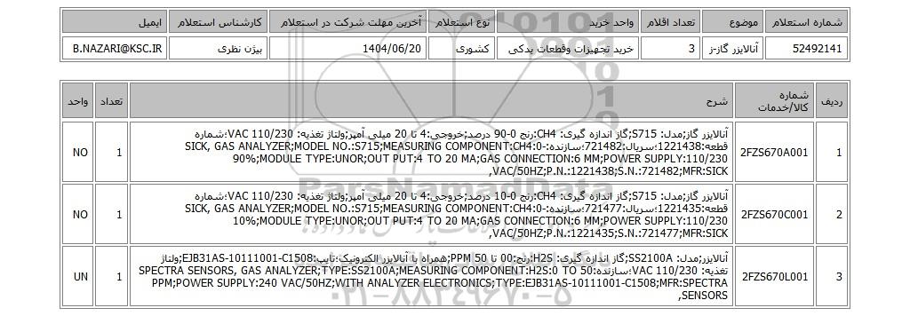 | 52492141 | آنالایزر گاز-ز | 3 | خرید تجهیزات وقطعات یدکی | کشوری | 1404/06/20 | بیژن نظری | B.NAZARI@KSC.IR |