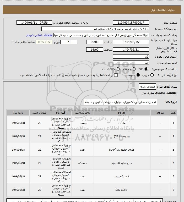 | 1 | -- | مادربرد | عدد | تجهیزات مخابراتی، کامپیوتر، موبایل، ملزومات جانبی و شبکه | 22 | 1404/06/18 |