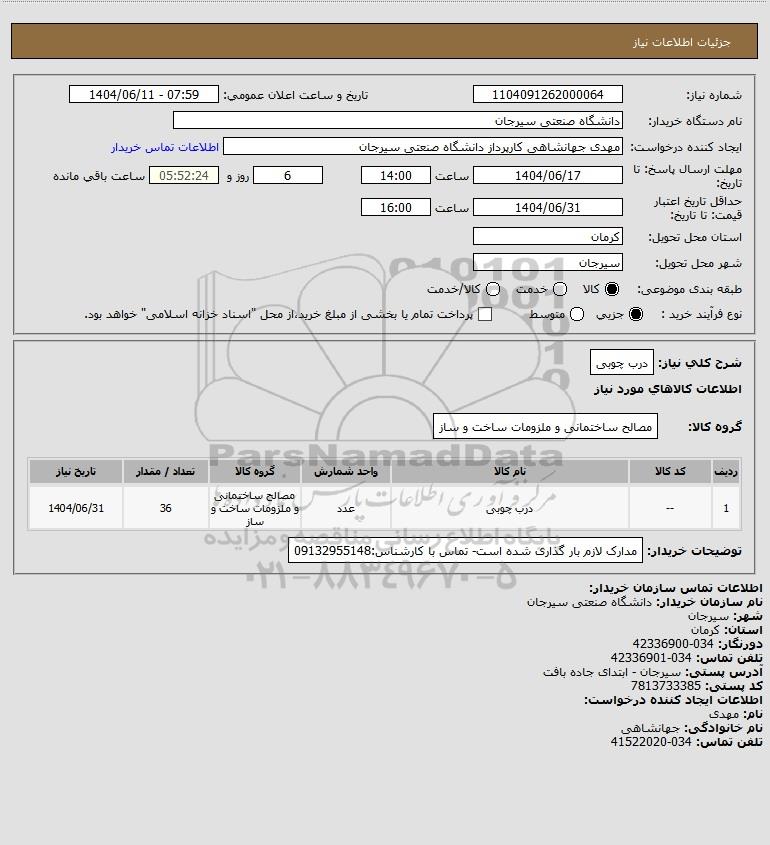 | 1 | -- | درب چوبی | عدد | مصالح ساختمانی و ملزومات ساخت و ساز | 36 | 1404/06/31 |