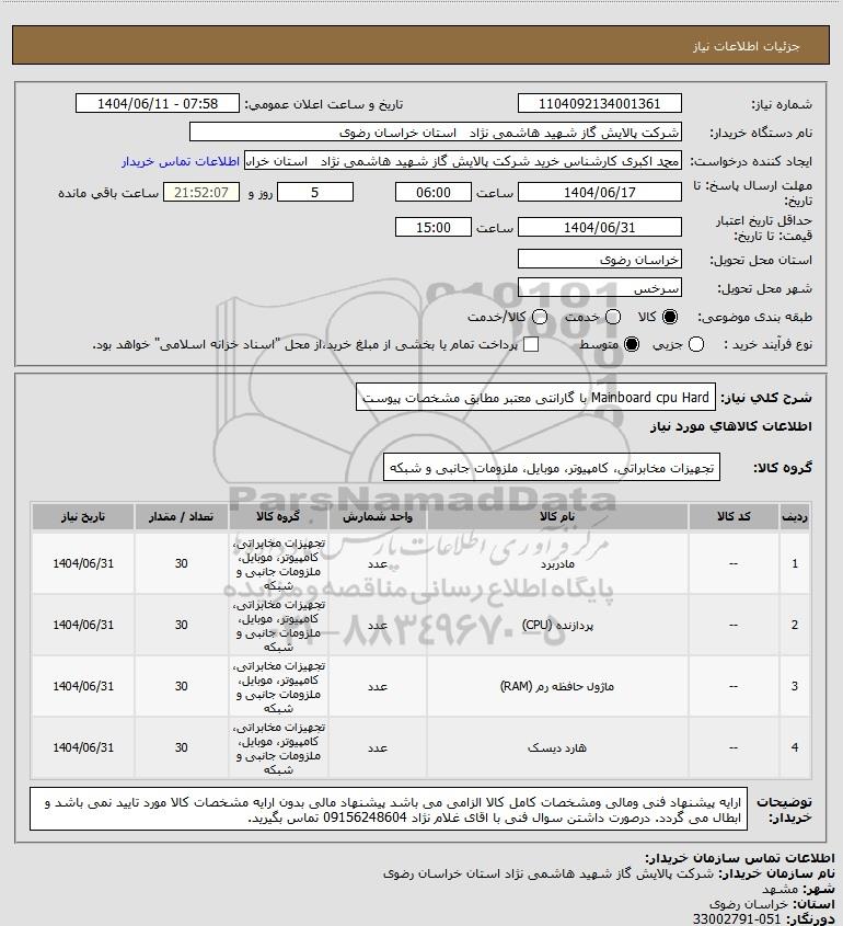 | 1 | -- | مادربرد | عدد | تجهیزات مخابراتی، کامپیوتر، موبایل، ملزومات جانبی و شبکه | 30 | 1404/06/31 |