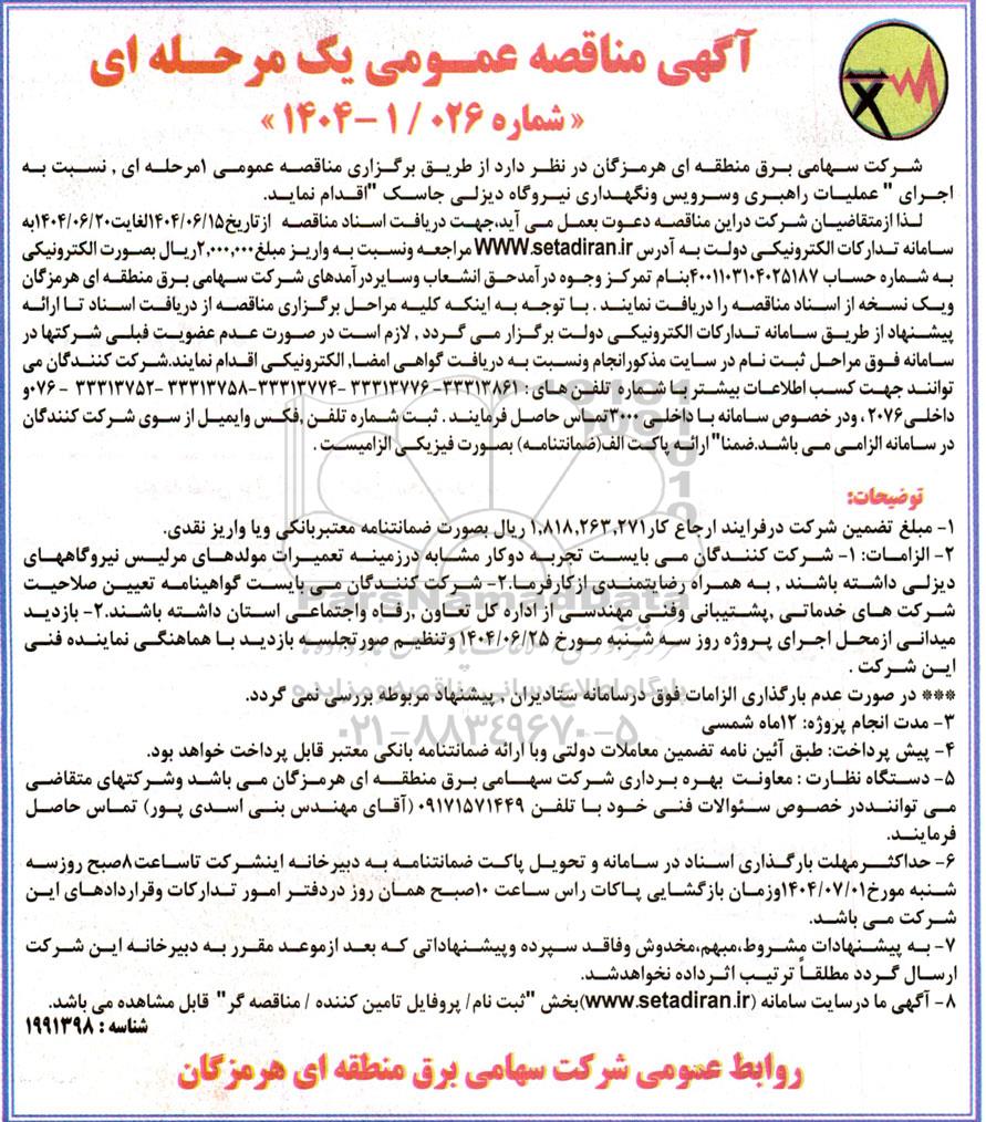 شرکت سهامی برق منطقه ای هرمزگان در نظر دارد از طریق برگزاری مناقصه عمومی 1 مرحله ای نسبت به اجرای "عملیات راهبری و سرویس و نگهداری نیروگاه دیزلی جاسک " اقدام نماید.