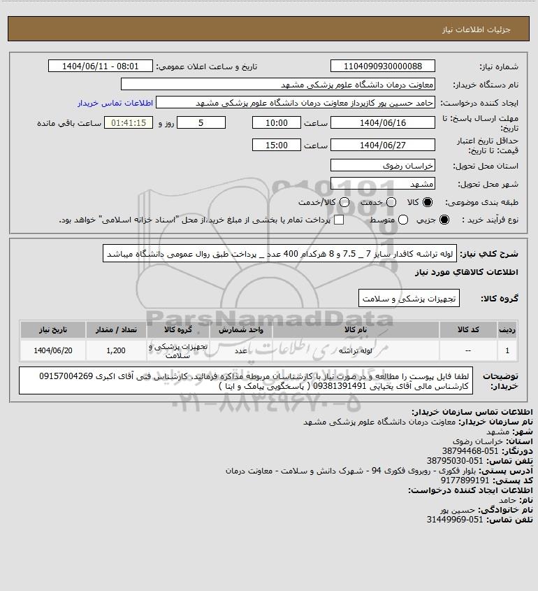 شرح کلی نیاز: لوله تراشه کافدار سایز 7 _ 7.5 و 8 هرکدام 400 عدد _ پرداخت طبق روال عمومی دانشگاه میباشد
