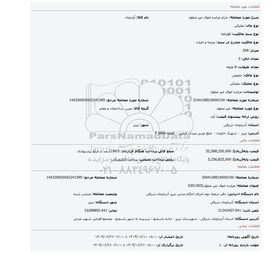 | شرح مورد معامله: حراج مزایده اموال غیر منقول | نام کالا: آپارتمان | |