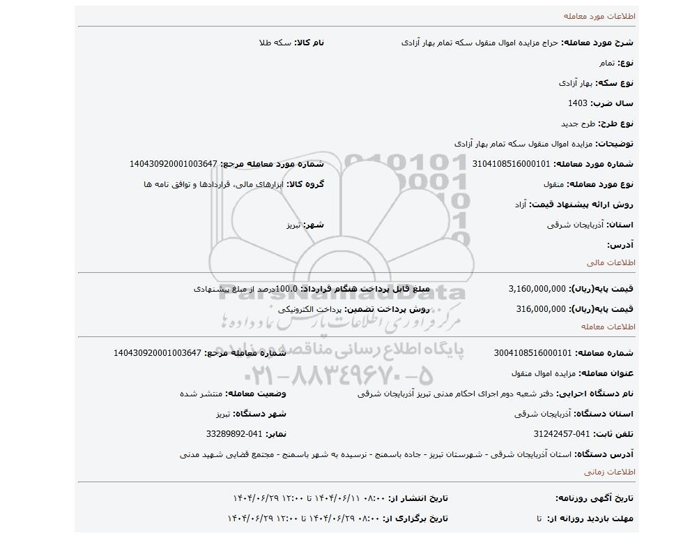 توضیحات: مزایده اموال منقول سکه تمام بهار آزادی