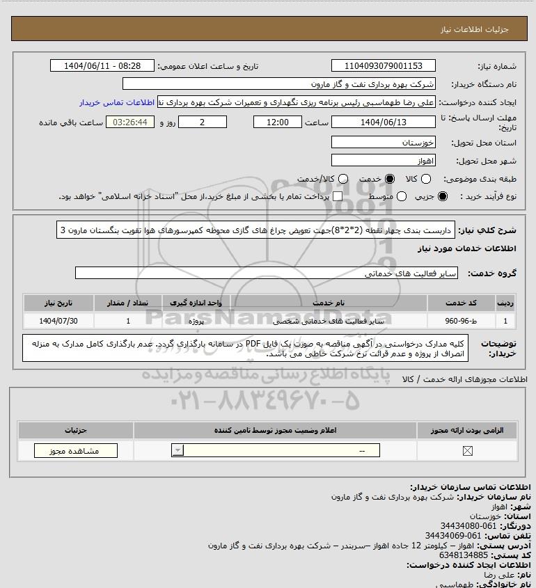 شرح کلی نیاز: داربست بندی چهار نقطه (2*2*8)جهت تعویض چراغ های گازی محوطه کمپرسورهای هوا تقویت بنگستان مارون 3