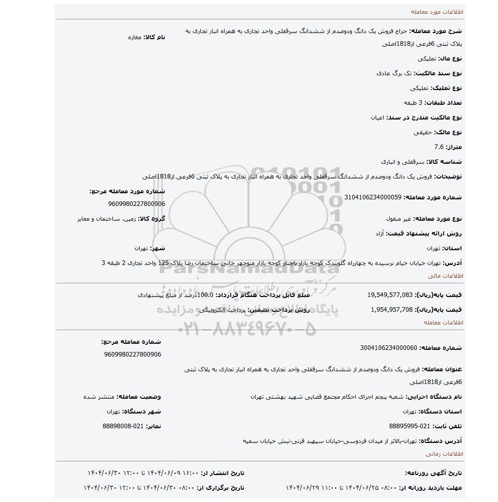 مزایده عمومی مزایده فروش یک دانگ ودوصدم از ششدانگ سرقفلی واحد تجاری به همراه انبار تجاری به پلاک ثبتی 6فرعی از1818اصلی برگزار میگردد. از کلیه افراد متخصص و شرکت‌های واجد شرایط دعوت به عمل می‌آید تا در این مزایده با کد خبرگزاری پارس نماد : 9486506 شرکت نمایند تاریخ شروع مزایده : 1404/06/09 مهلت شرکت در مزایده: تا پایان روز 1404/06/30 مکان برگزاری اموال واگذاری استان‌های تهران و دسته‌بندی‌های مربوط به این حراجی املاک و زمین میباشد. اطلاعات دقیق‌تر درباره شرایط شرکت در مزایده آنلاین و نحوه ارسال مدارک، الزامات پروژه و دریافت اسناد مزایده و تاریخ بازگشایی پاکت‌ها، در بخش اطلاعات تکمیلی این آگهی درج شده است.