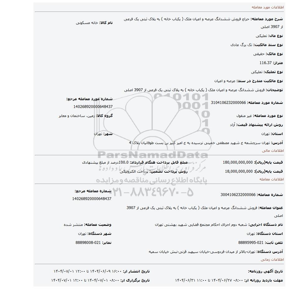 قیمت پایه(ریال): 18,000,000,000روش پرداخت تضمین: پرداخت الکترونیکی